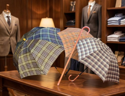 Ombrello di cotone con fantasia scozzese con manico in acero