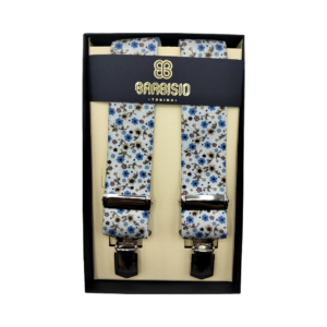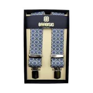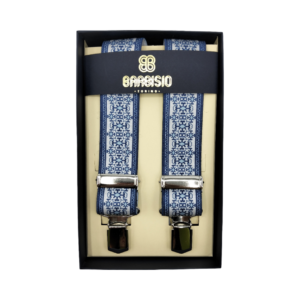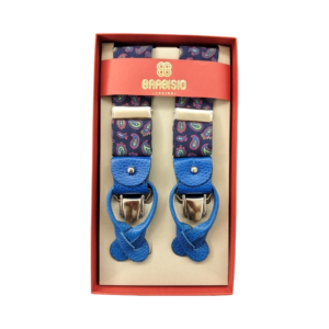 Bretelle in tessuto con asole e ganci fantasia paisley blu