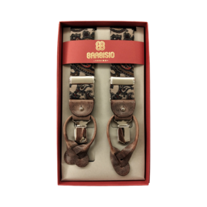 Bretelle in tessuto con asole e ganci fantasia paisley su fondo sabbia
