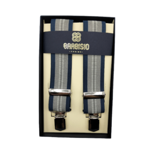 Bretelle in tessuto con asole e ganci fantasia rigata blu beige