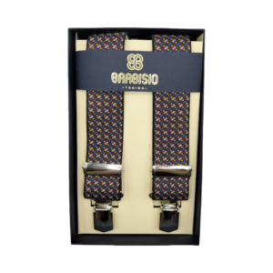 Bretelle in tessuto con asole e ganci fantasia rigsta marrone e azzurro