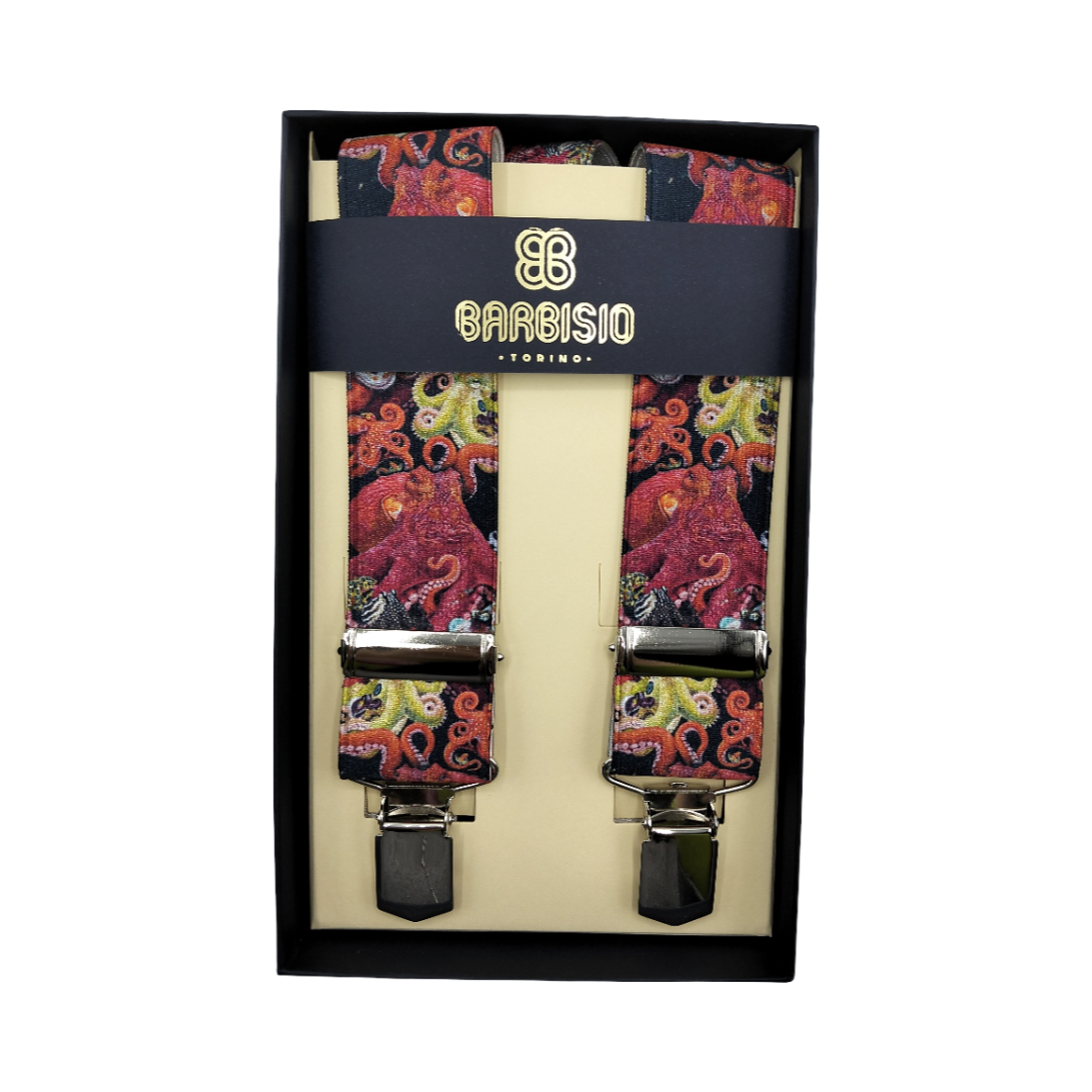 Esprimi la tua personalità con un accessorio che fonde la maestria artigianale di Torino con un design audace e vibrante. Queste bretelle Barbisio non sono un semplice supporto, ma un vero pezzo da collezione. Il pattern a tema “Octopus” (polpo), caratterizzato da sfumature intense di rosso, arancio e tocchi di verde acido su fondo scuro, conferisce un carattere eclettico e sofisticato a chi non ha paura di distinguersi con eleganza.