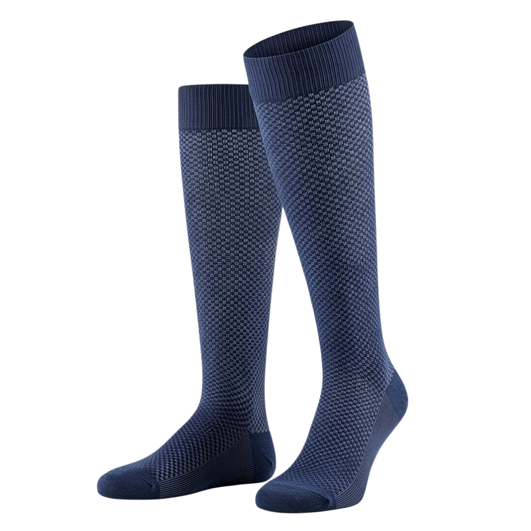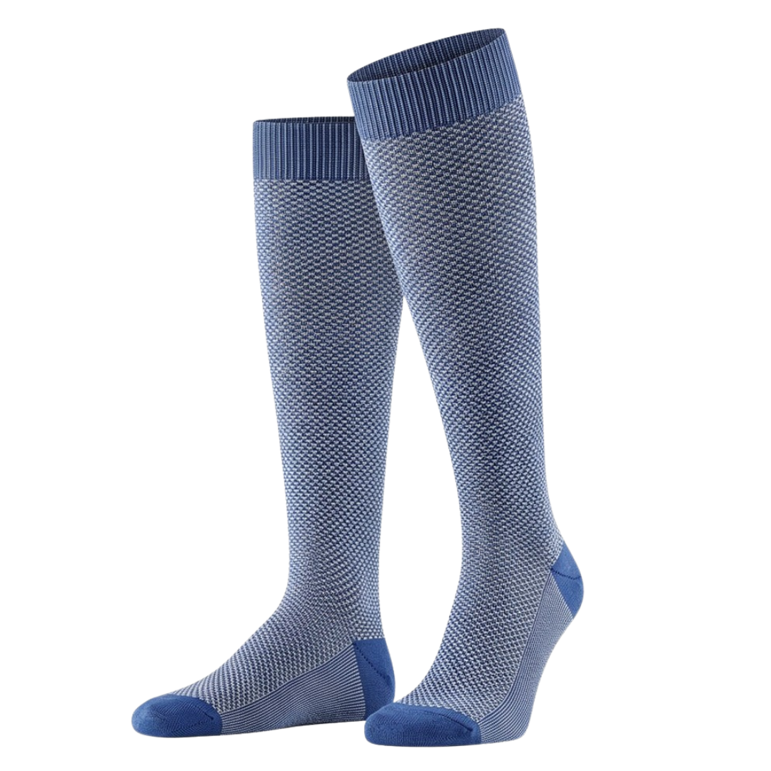 Grazie alla sua lunghezza classica al ginocchio, questa calza è il complemento ideale per un abito sartoriale o un pantalone chino elegante. Il gioco di colori “ton sur ton” si abbina magnificamente a calzature in pelle scura (testa di moro o nero) o a mocassini scamosciati. Perfetta per il professionista che desidera aggiungere un tocco di personalità cromatica al proprio look formale senza rinunciare alla sobrietà.