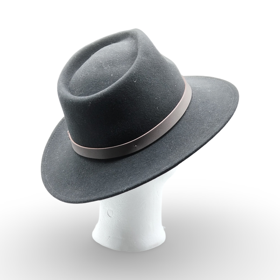 Design Distintivo: Corona alta con pizzicature classiche e una tesa generosa che dona profondità allo sguardo.