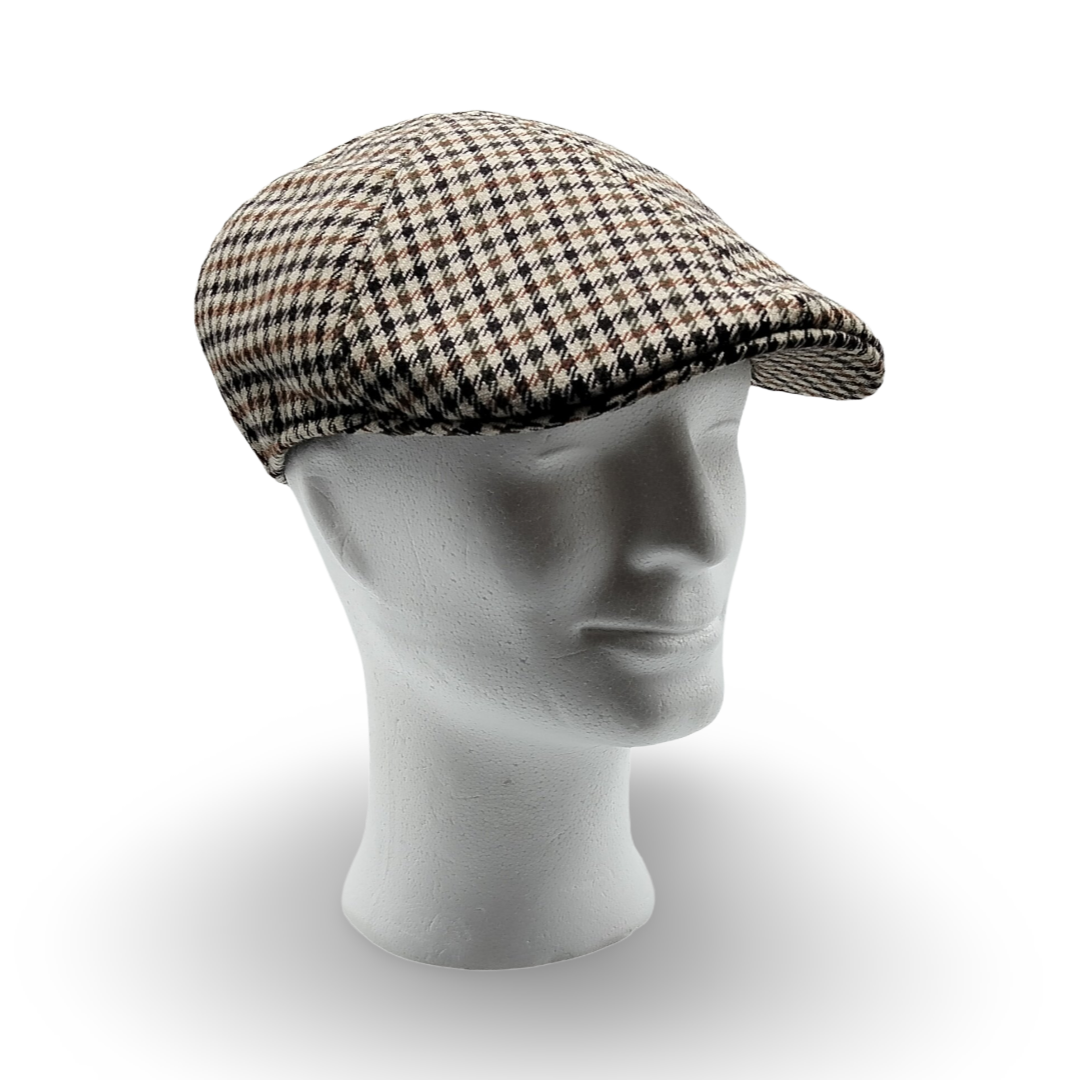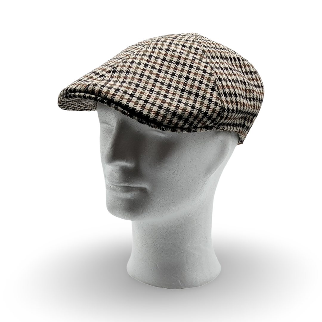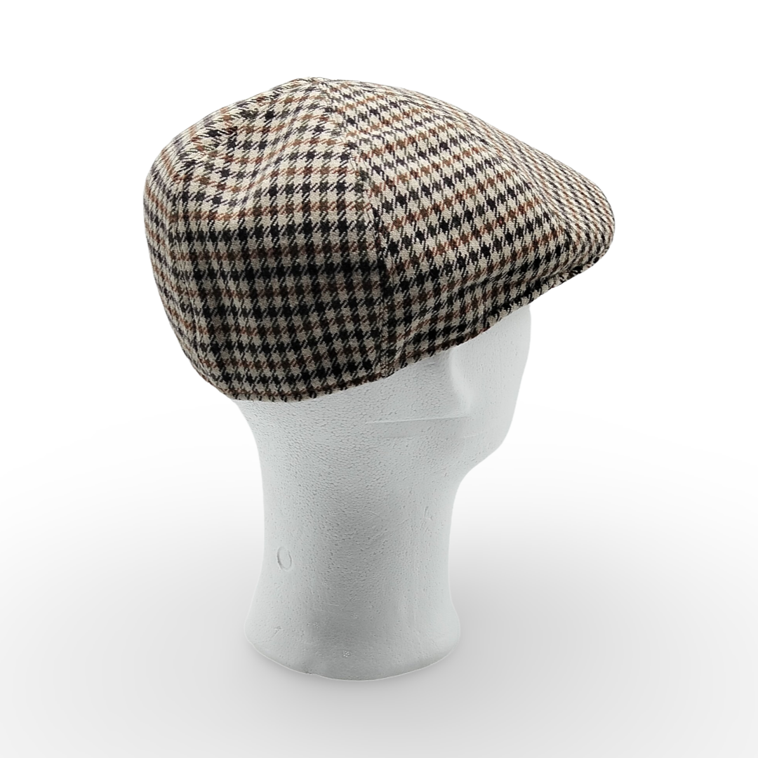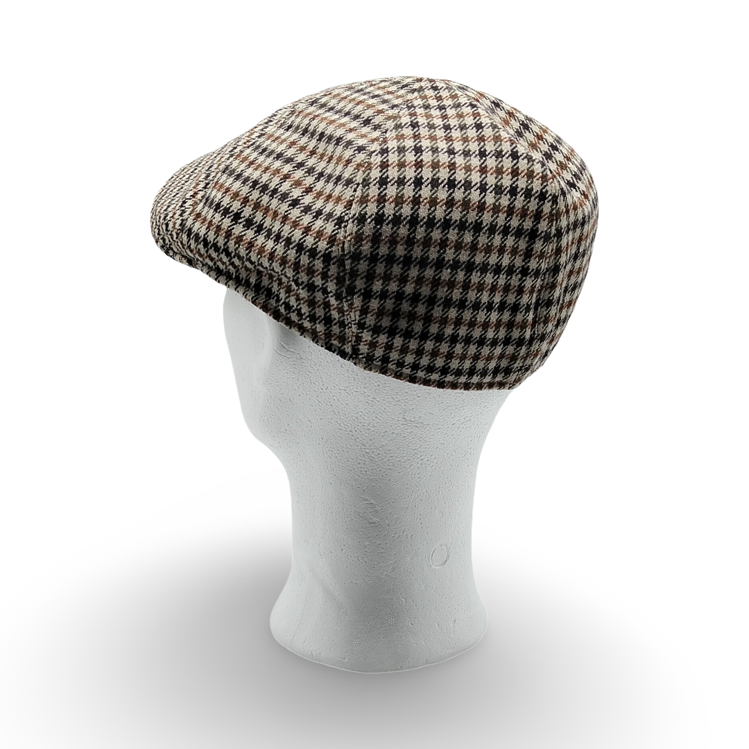 La trama Pied de Poule incontra la linea affusolata della coppola a “Becco d’Oca”, creando un accessorio dal fascino aristocratico e dal piglio contemporaneo. Questo motivo iconico, nato nelle Highland scozzesi, viene qui declinato in una versione di altissima qualità sartoriale, pensata per l’uomo che apprezza i dettagli storici dell’abbigliamento maschile. La geometria del tessuto crea un gioco ottico sofisticato che dona luce al viso e profondità a tutto l’insieme.
