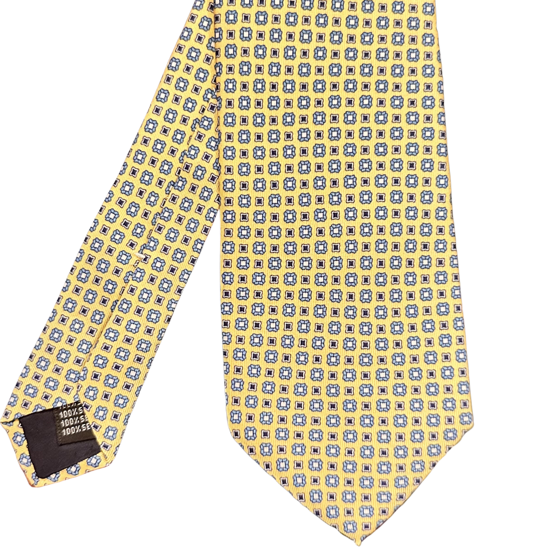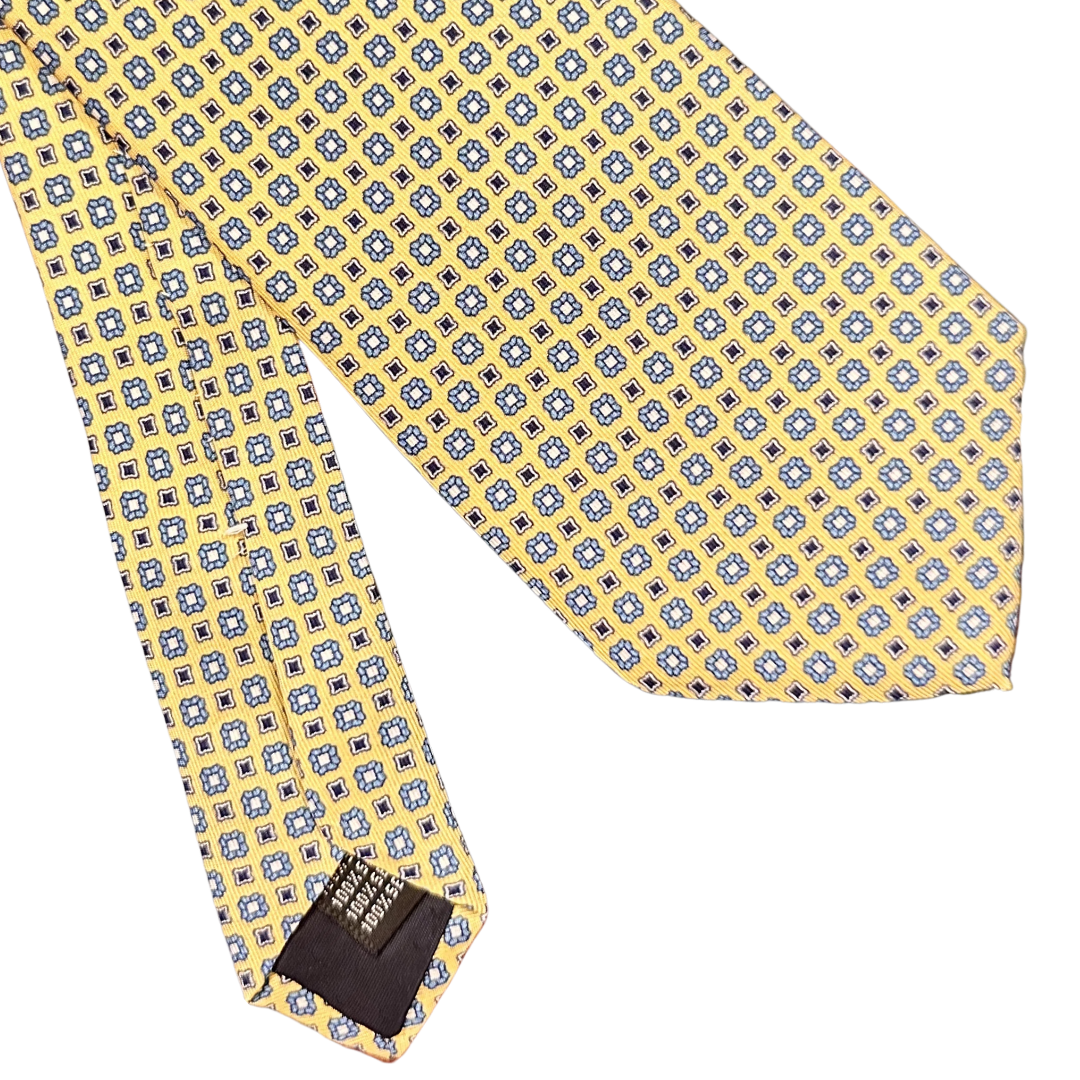 Un’iniezione di luce e rigore formale. Questa cravatta incarna uno stile audace ma estremamente curato, dove il fondo giallo zafferano viene esaltato da un “disegnino” a micro-quadratini. La trama geometrica smorza l’intensità del colore, conferendo all’accessorio una texture tridimensionale e un’eleganza sofisticata. È la scelta d’elezione per l’uomo che vuole distinguersi con un accessorio solare, perfetto per illuminare i completi più scuri con un tocco di “british eccentricity”.