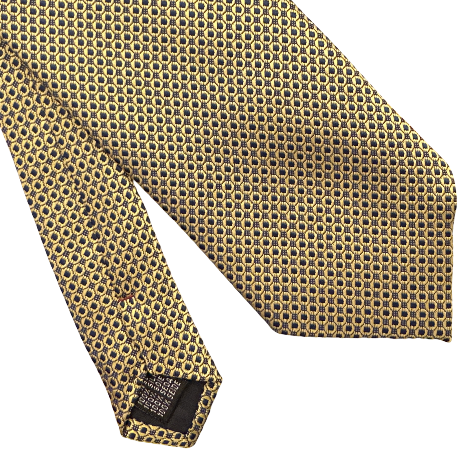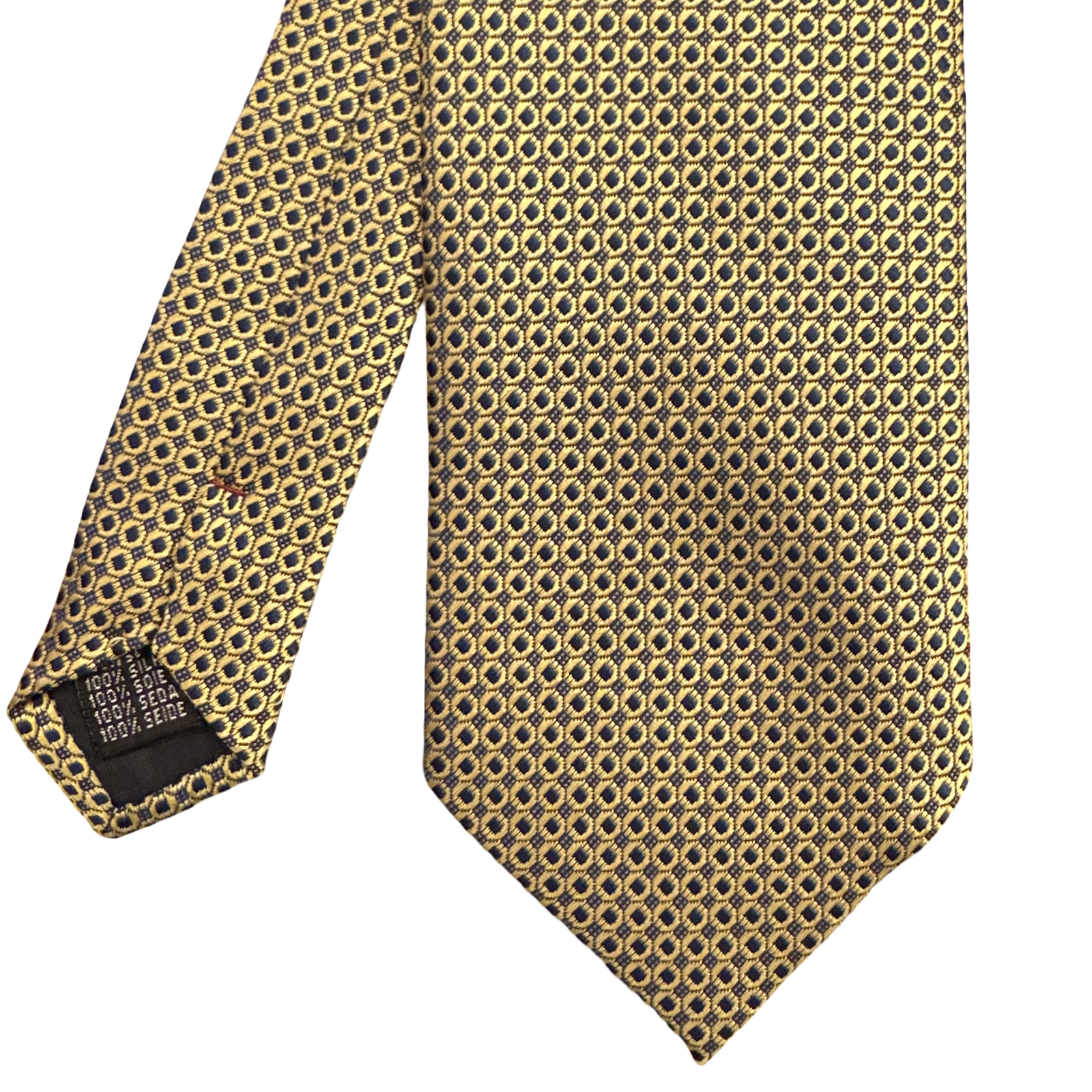 Cravatta fantasia geometrica con base blu e disegno giallo oro