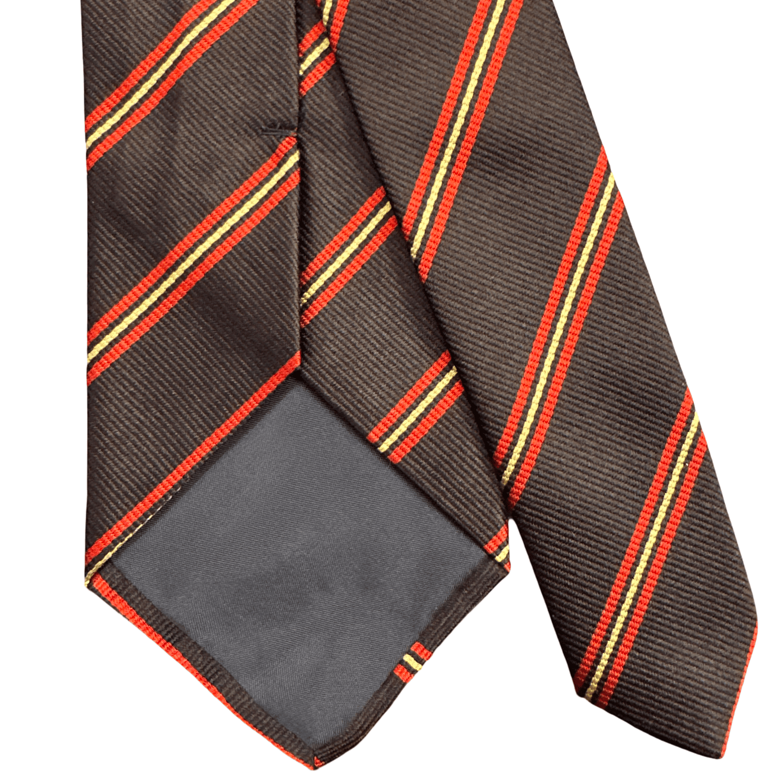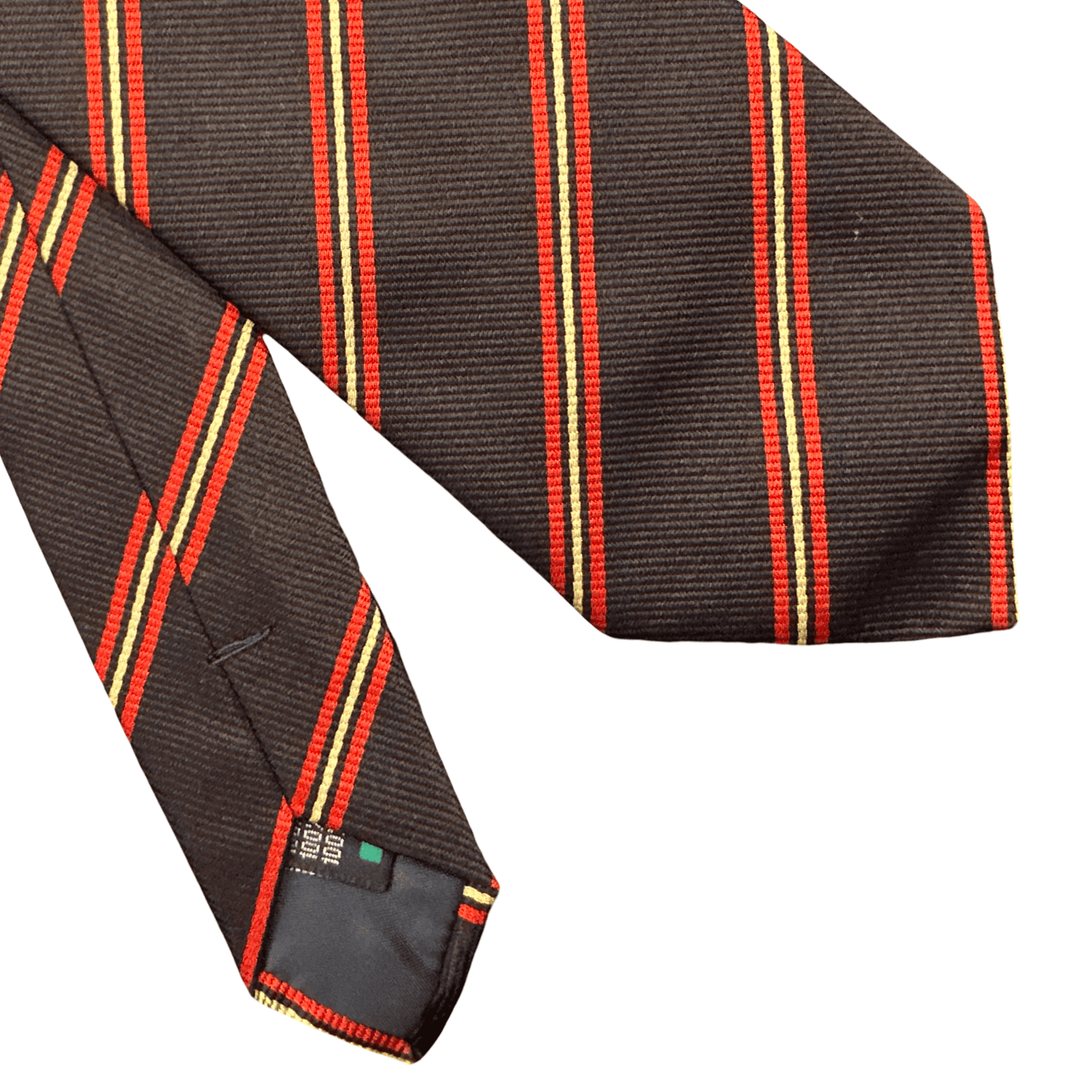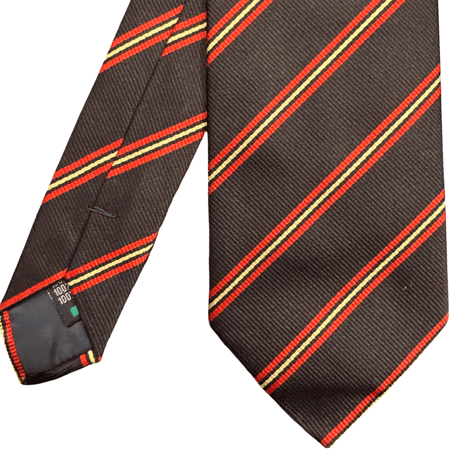 Questa cravatta Reggimental incarna un’eleganza rigorosa e senza tempo. Il fondo nero profondo è solcato da decise righe rosse bordate da sottili inserti color oro, creando un contrasto cromatico che evoca nobiltà e distinzione. Realizzata interamente in 100% seta di alta qualità, questo accessorio rappresenta il perfetto equilibrio tra la tradizione dei club d’oltremanica e l’eccellenza della manifattura italiana, ideale per chi non vuole passare inosservato con discrezione.
