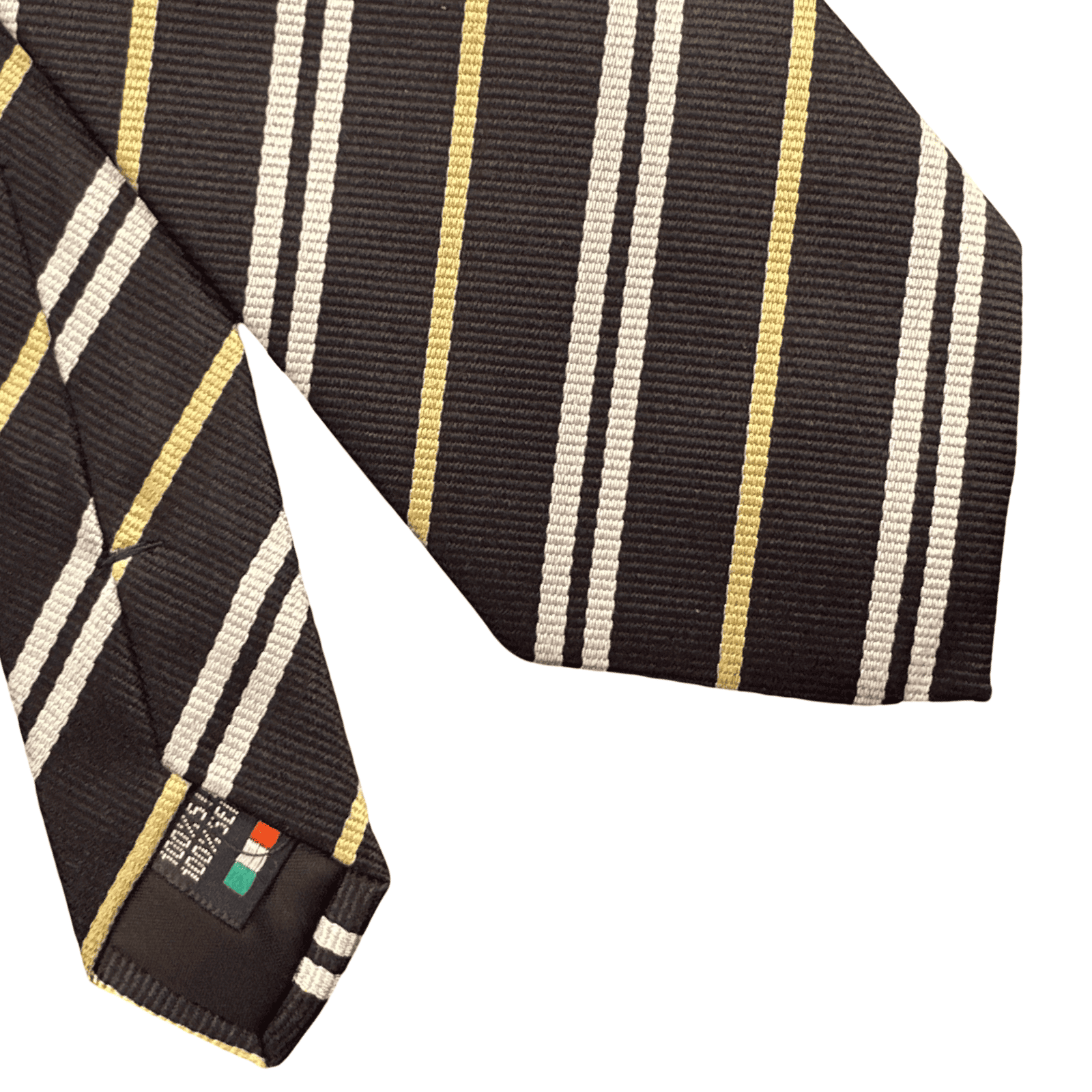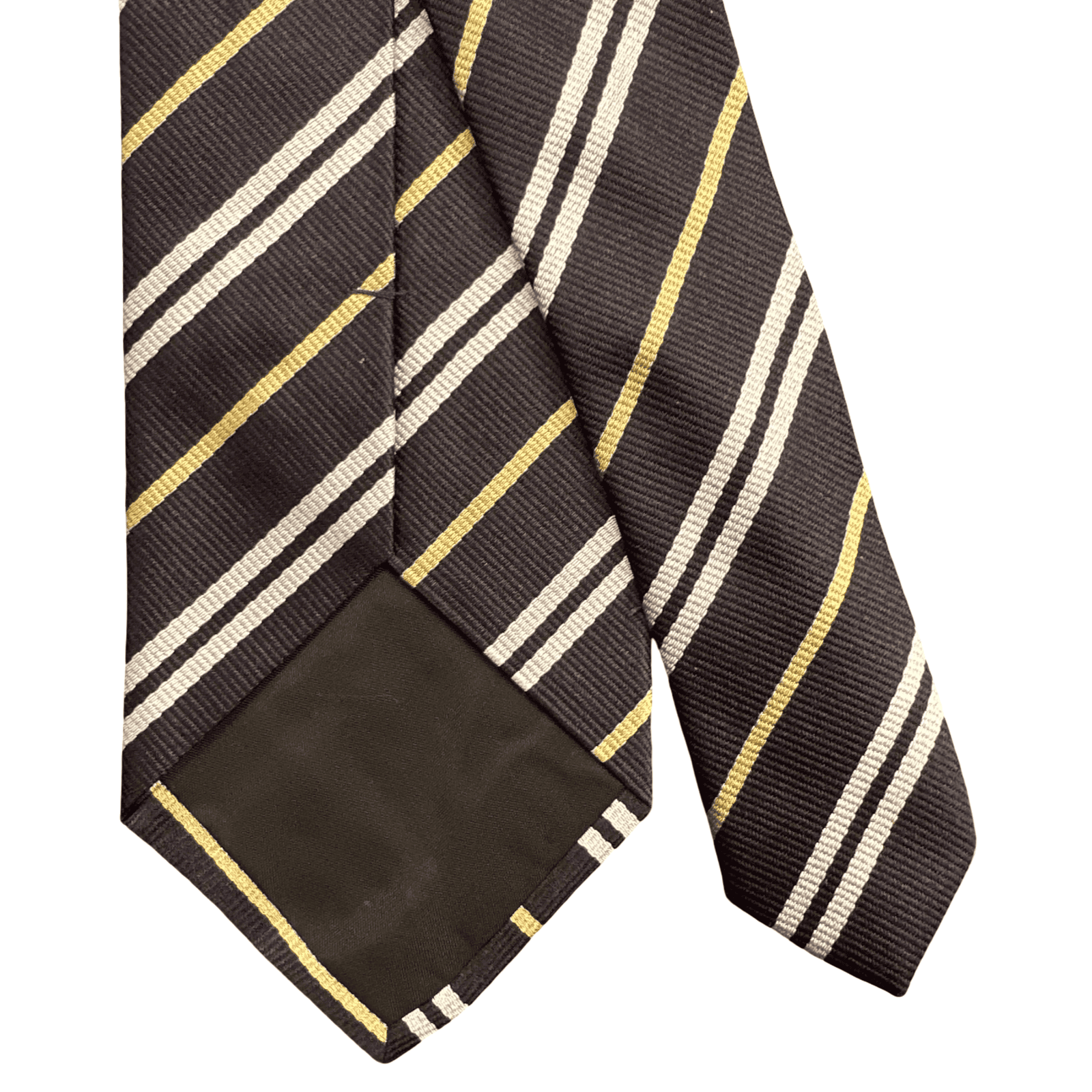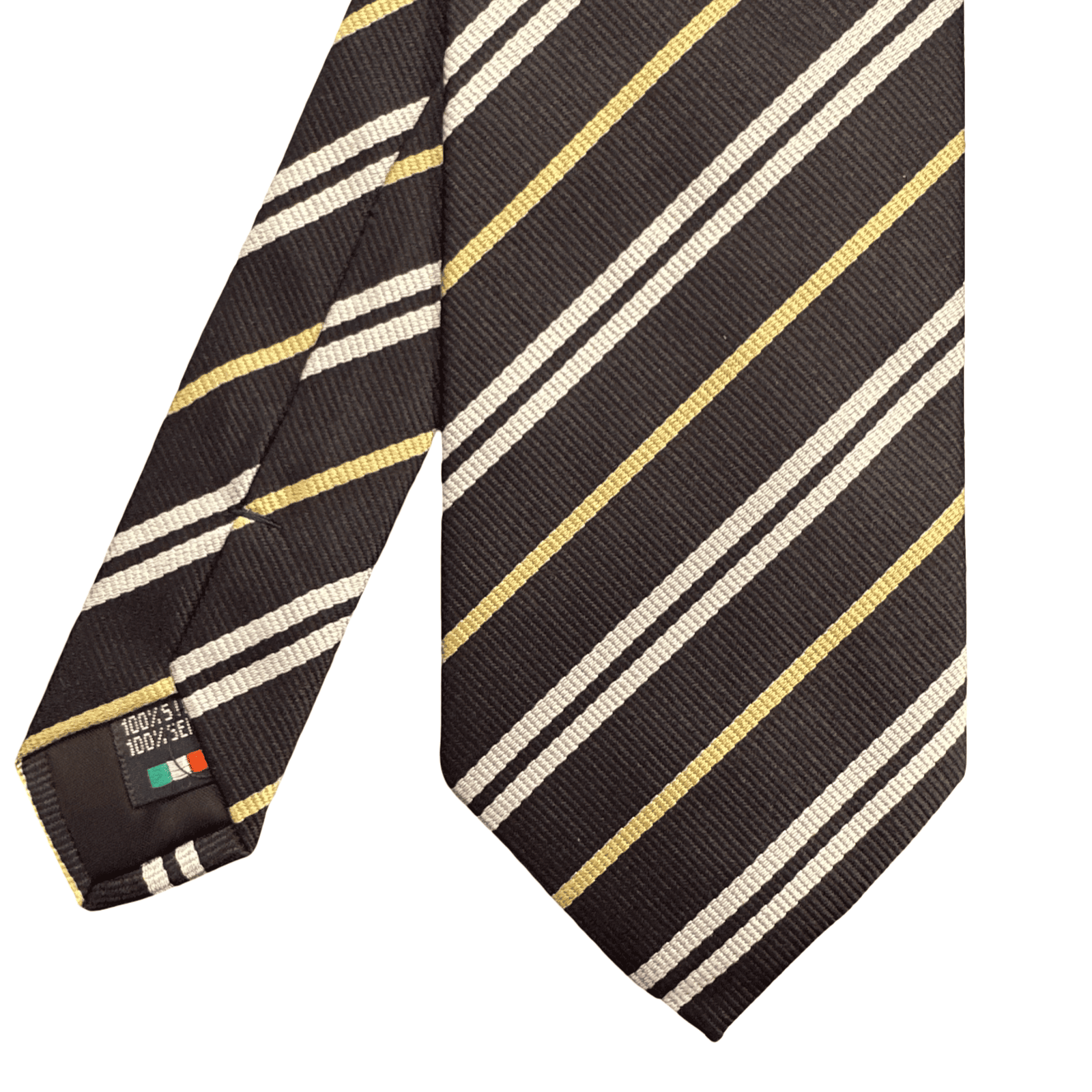 Il contrasto cromatico definitivo: questa cravatta Reggimental eleva il concetto di accessorio classico a vera e propria dichiarazione di stile. Il fondo nero, intenso e profondo, fa da palcoscenico a un pattern di righe bianche nitide e preziosi inserti color oro, creando un effetto visivo di estrema pulizia e prestigio. Realizzata in 100% seta di altissima qualità, è l’accessorio che incarna l’anima storica di Barbisio Torino: eccellenza nei materiali e design senza tempo.