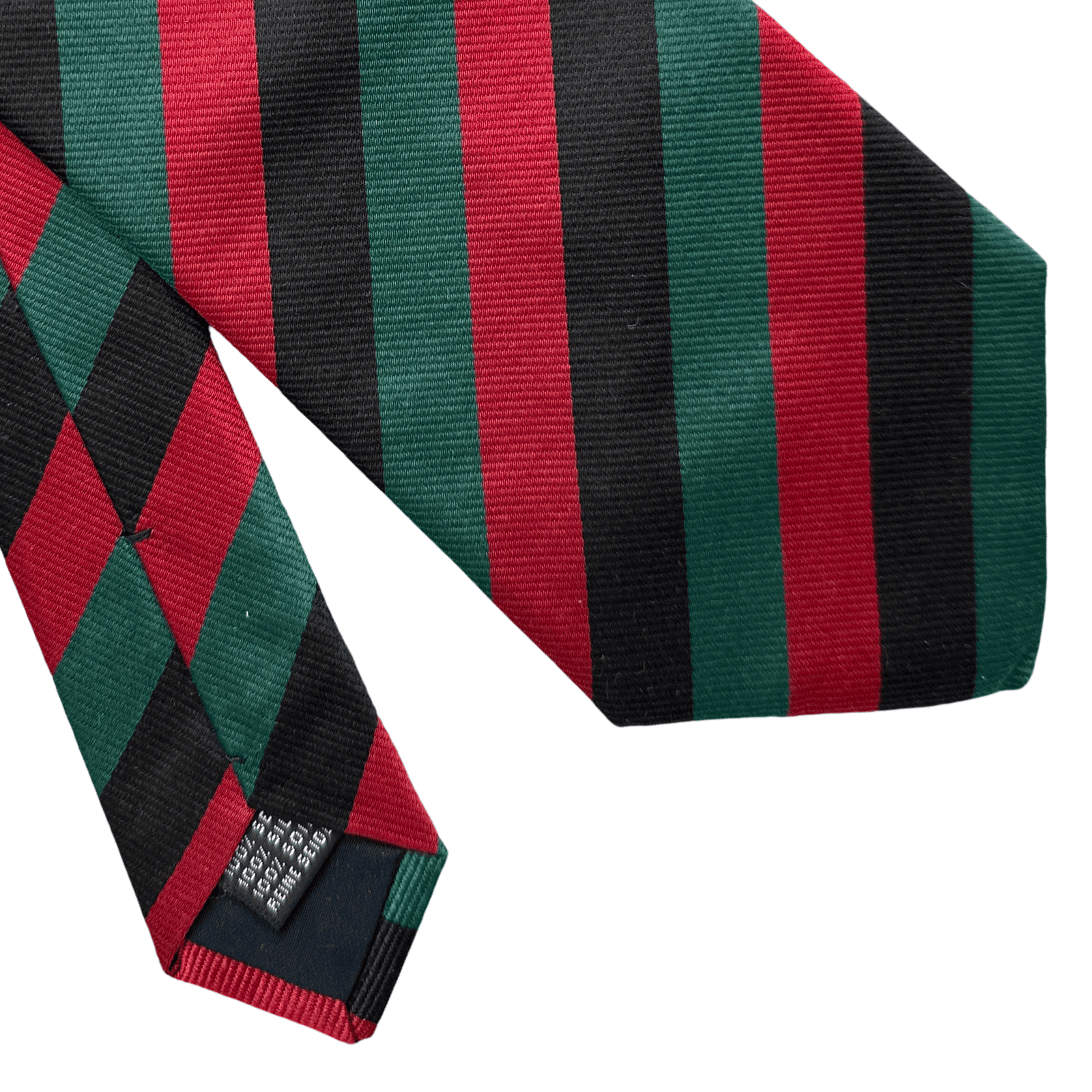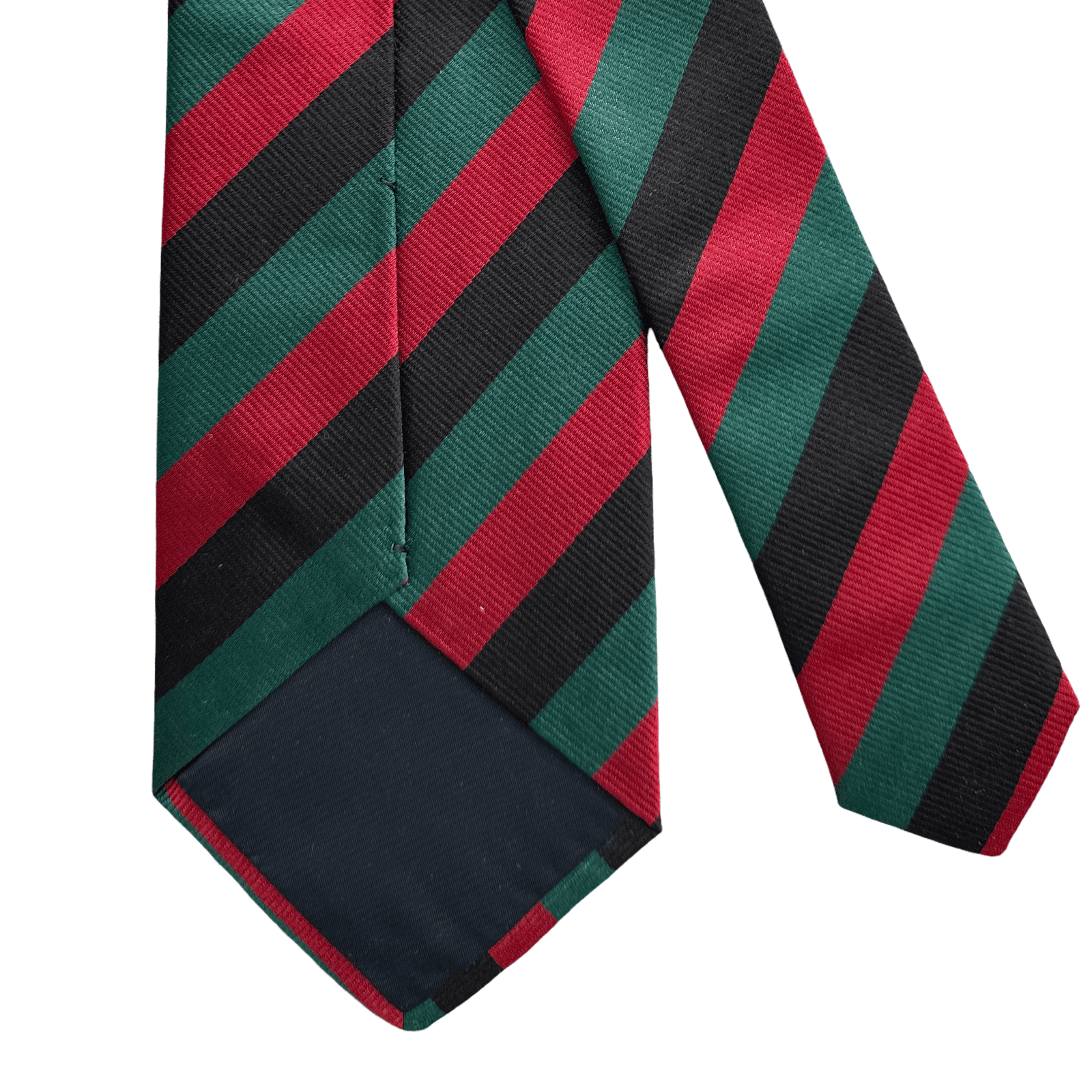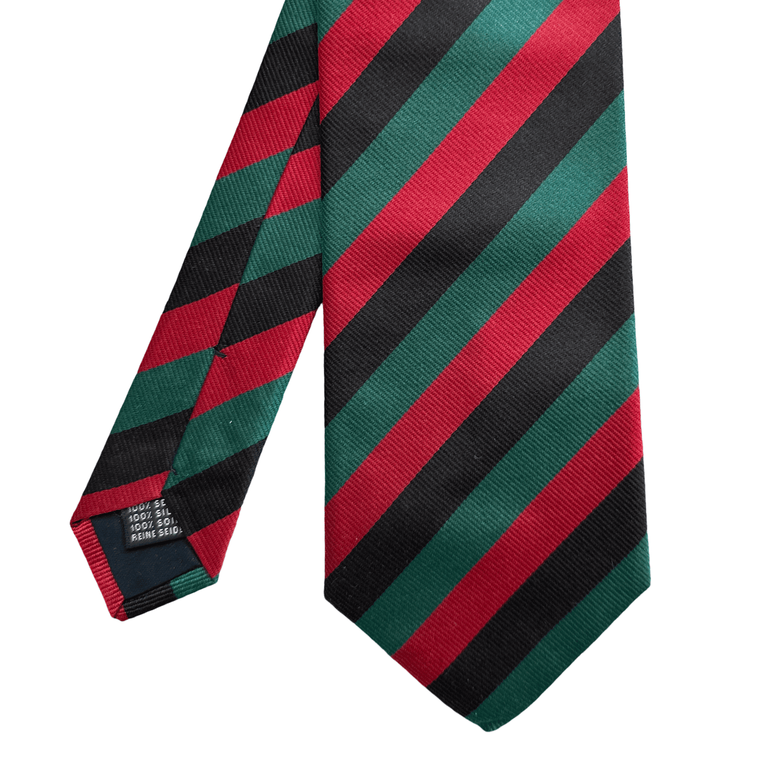 Un accessorio che incarna l’essenza dell’eleganza Old England. Questa cravatta Reggimental gioca su una triade cromatica di grande impatto: il verde bosco e il rosso rubino si alternano in un ritmo armonioso, separati da decise righe nere che donano struttura e profondità al disegno. Realizzata in 100% pura seta, questa creazione di Barbisio Torino è dedicata all’uomo che apprezza i classici intramontabili e desidera un accessorio capace di infondere carattere e calore anche al più formale dei completi.