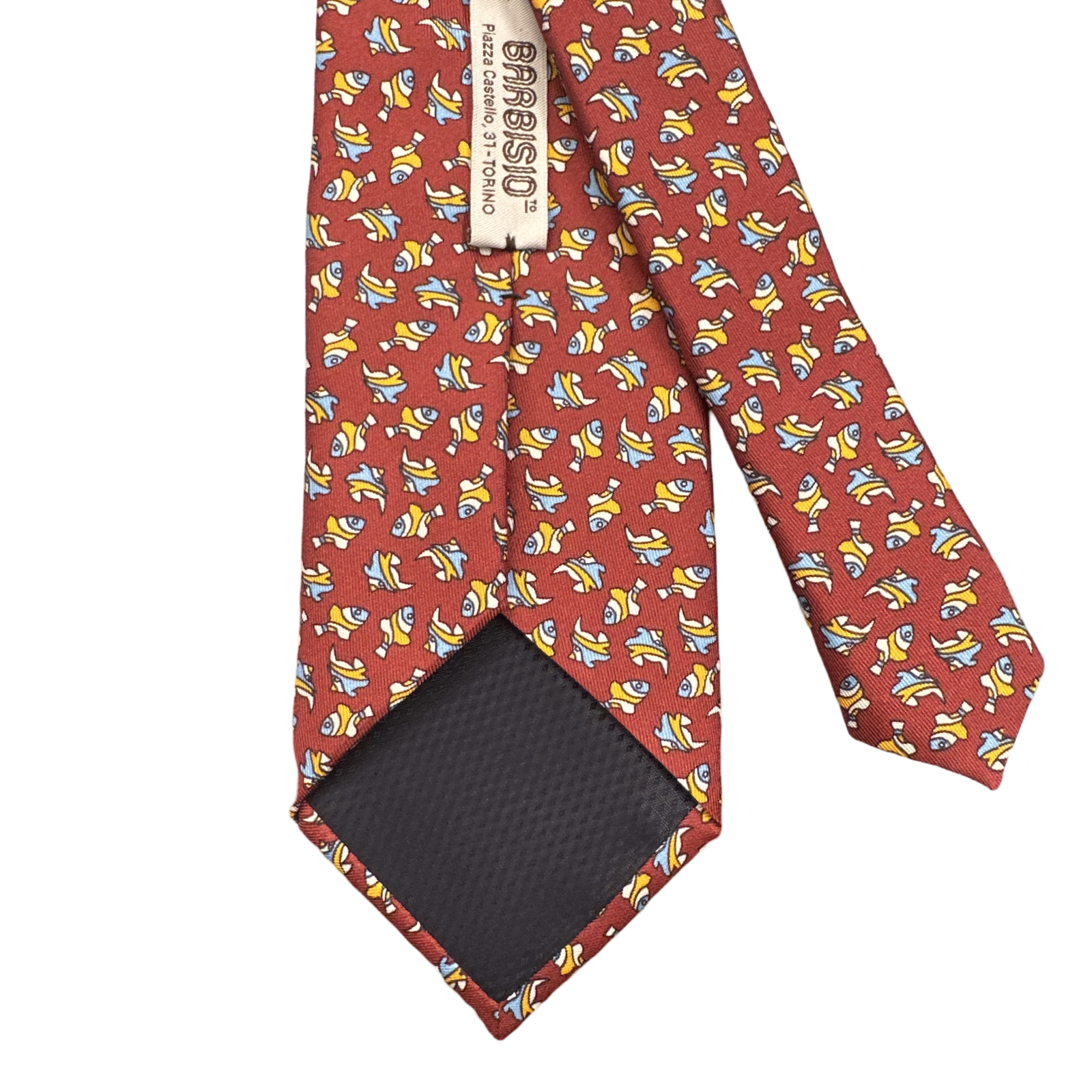 Cravatta rossa fantasia pesci stilizzati arancioni e azzurri