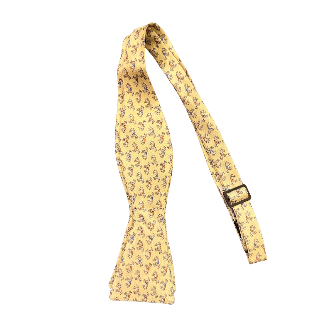 Un omaggio alla tradizione equestre più nobile, reinterpretata con un tocco di ironia e luce. Questo papillon da annodare rappresenta la quintessenza dello stile gentleman farmer: un fondo giallo vibrante che ospita una meticolosa fantasia a piccoli pony. La scelta del modello “self-tie” (da annodare) non è solo una questione di stile, ma una dichiarazione d’intento per l’uomo che apprezza l’imperfezione sapiente e il volume naturale che solo un nodo fatto a mano può conferire. Un accessorio che parla di passioni, di aria aperta e di una ricercatezza mai banale.