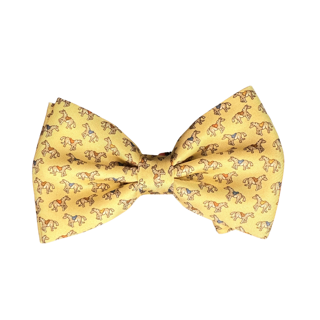 Il papillon giallo con fantasia pony è il protagonista indiscusso degli outfit estivi e primaverili. Si sposa divinamente con un abito in lino blu navy o una giacca sportiva grigio chiaro. Per un look country-chic impeccabile, indossalo con una camicia bianca o azzurra a micro-quadretti. È l’accessorio perfetto per matrimoni all’aperto, cocktail party o eventi legati al mondo dell’ippica, dove il colore e il tema figurativo comunicano una personalità aperta e originale.