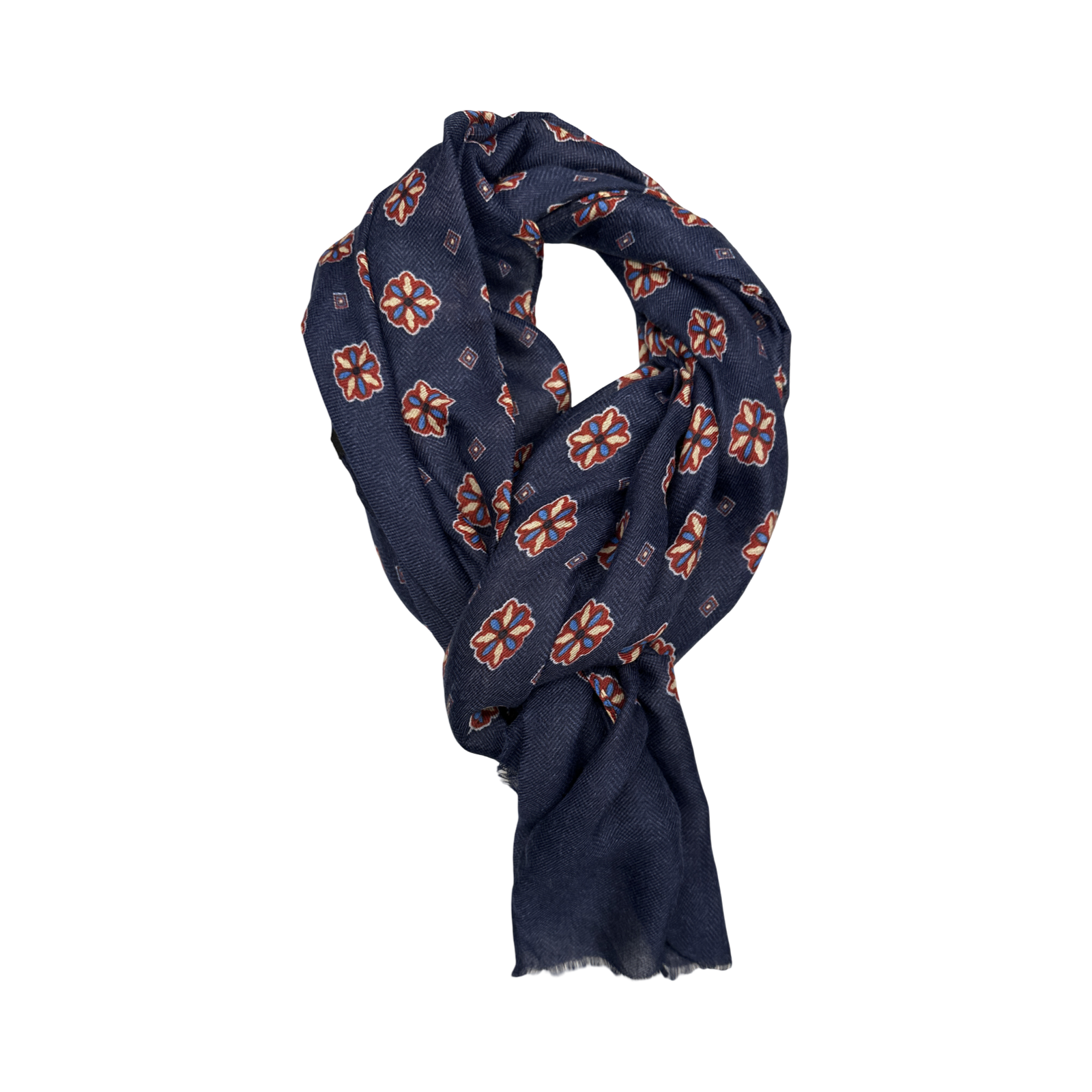 • Versatilità Cromatica: Il profondo fondo blu si abbina con facilità a cappotti cammello, grigi, neri e ovviamente blu navy, rendendola un accessorio versatile per ogni occasione.